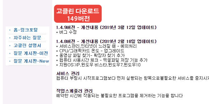 이동을 하자마자 좌측 상단에 보시면 고클린 다운로드라고 해서 바로 파일을 받아보실 수 있는 버튼이 마련되어 있는 것을 확인해보실 수가 있으실텐데요.