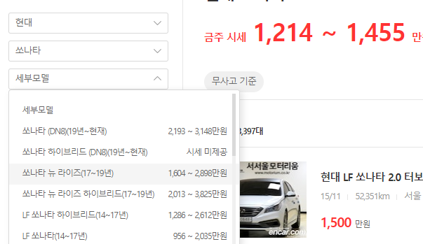 소나타도 소나타 나름이죠. 달리 이야기를 하면 소나타도 모델이 굉장히 다양하다는 이야기인데요. 다양한 모델들 중에서 여러분들이 구매를 하고자 하는 모델 한가지를 선택해주시면 바로 그 우측에서 위에 보시는 것처럼 시세가 어느 정도에 분포되어 있는지 간단하게 확인을 해보실 수가 있게 되겠습니다.
