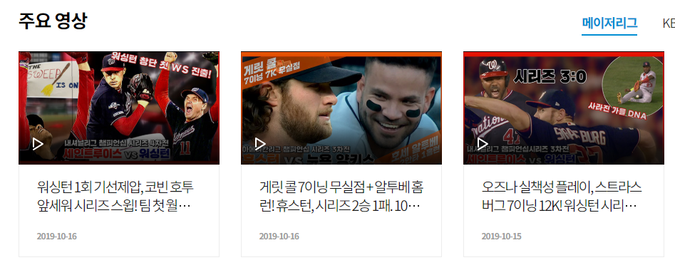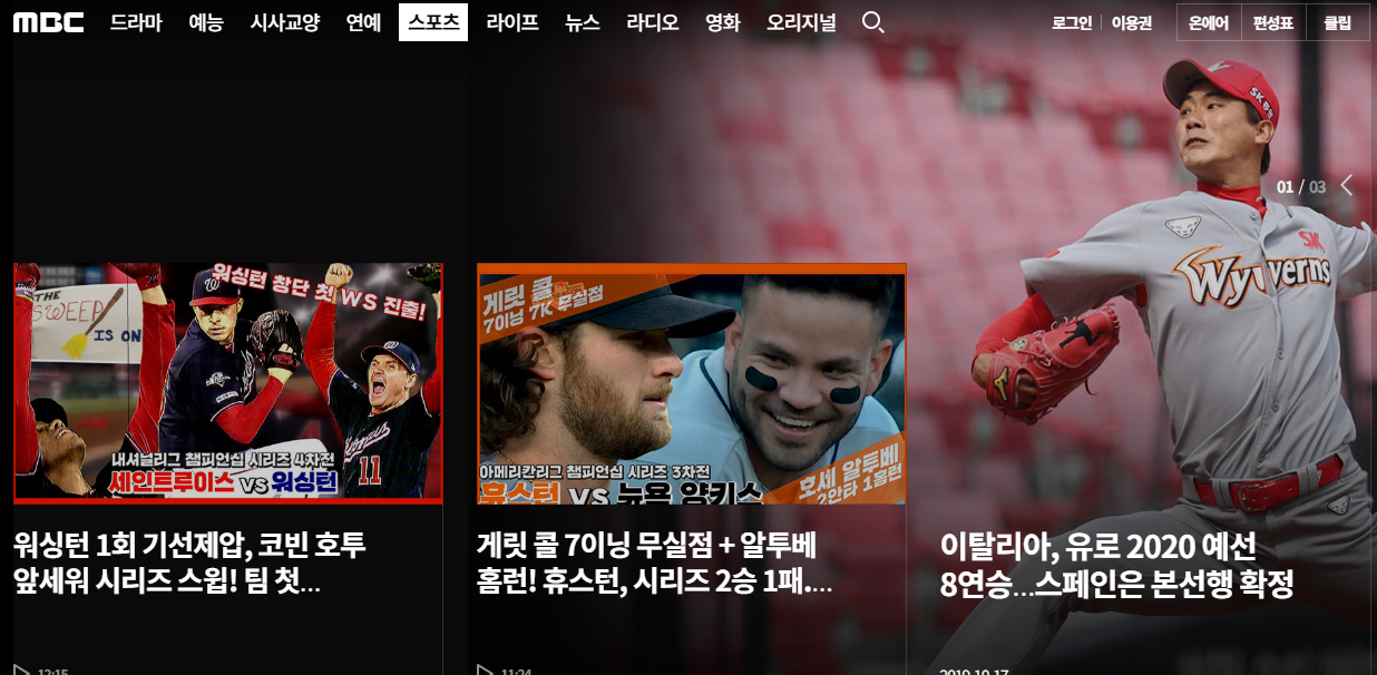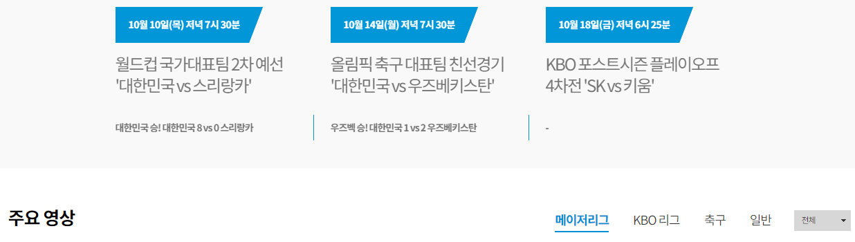 스포츠라는 메뉴 눌러주시게 되면 간단한 하이라이트만을 볼 수 있는 동영상 리스트들을 확인하는 것이 가능하겠는데요. 각각의 동영상 목록 하단을 집중해주시길 바라겠습니다. 그러면 어떠한 종목이 언제 방송을 하는지 생중계 계획에 관한 목록을 바로 확인을 해보실 수가 있게 되겠습니다.