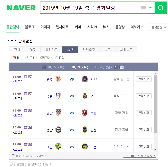 보시는 것처럼 특정한 날짜를 입력해주신 다음 축구 경기일정이라고 검색을 해주시게 되면 위에서 보시는 것처럼 여러분들이 지정한 날짜에 어떠한 시간에 어느 팀이 축구를 하는지 간단하게 그 일정을 확인해보시는 것이 가능하게 되겠습니다.