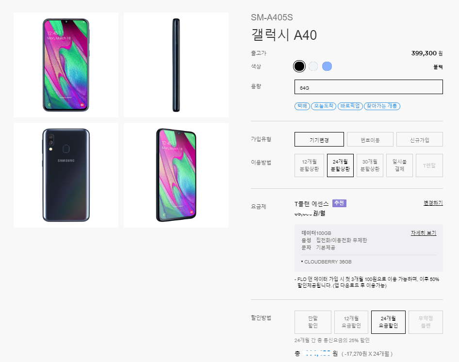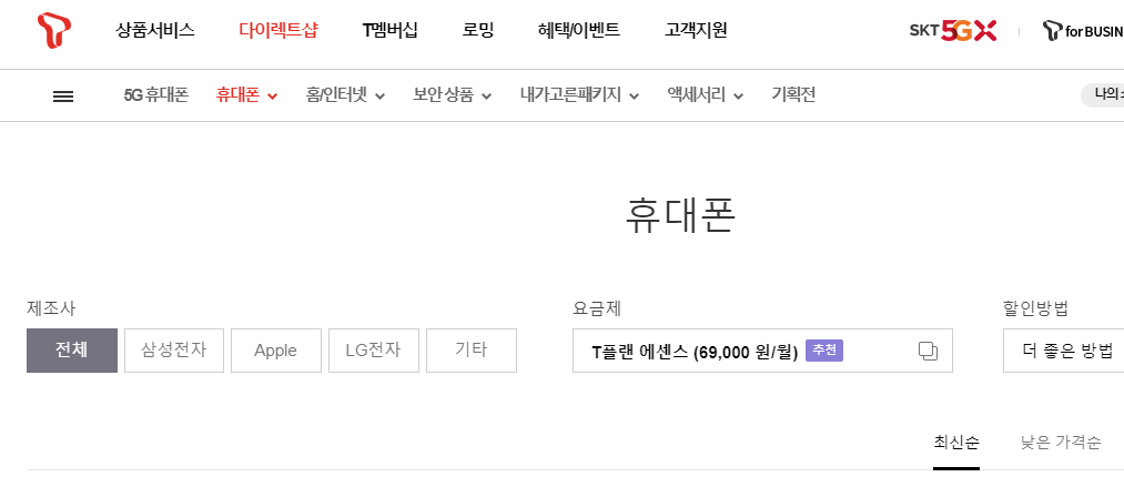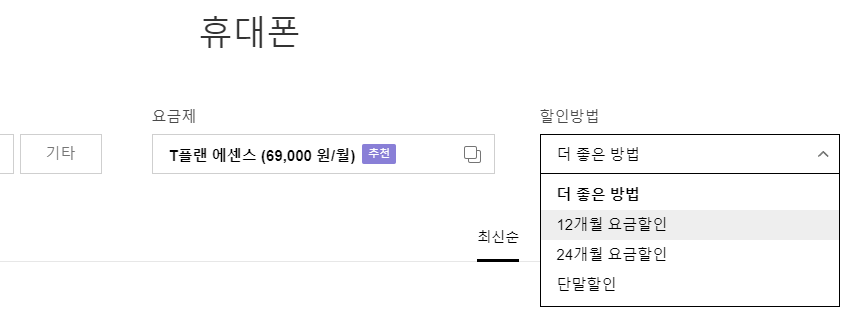 동일한 화면을 보고 있으시다면 제대로 이동을 하신 것인데요. 이동을 해주시고 나면 상단에 제조사와 함께 요금제 그리고 할인방법에 관한 선택을 할 수 있는 공간을 확인하실 수가 있겠습니다.
