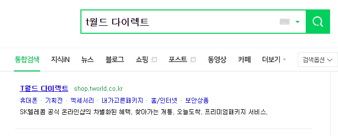 주소를 직접 쳐서 이동을 해주셔도 좋겠습니다. 하지만 구입에 관한 정보를 확인하시려면 그냥 검색사이트를 이용하시는 것이 좀 더 수월하지 않을까 하는 생각을 해보는데요. 다들 잘 아시고 자주 활용하시는 검색사이트가 아닐까 생각이 됩니다. 위에서 보시는 것처럼 t월드 다이렉트로 검색을 해주신 다음 바로 홈페이지로 이동을 하시지 마시고 그 하단에 있는 휴대폰이라는 메뉴로 이동을 해주시면 되겠습니다.