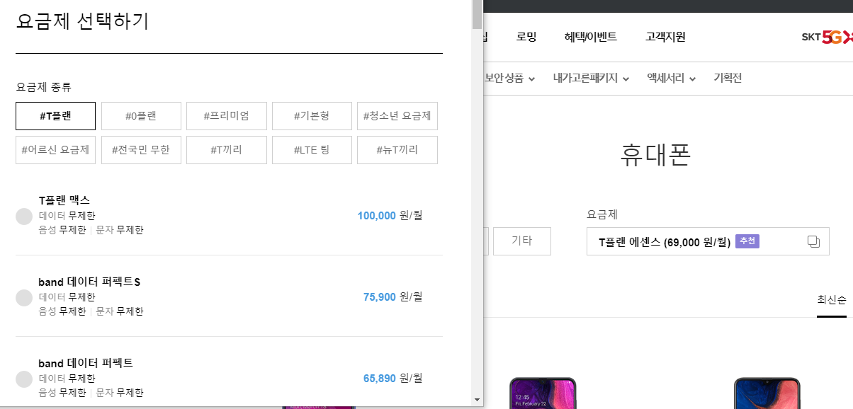 우선 여러분들이 구입을 하고자 하는 스마트폰의 제조사를 선택해주시면 되겠습니다. 그리고 사용을 하고자 하는 요금제 하나를 선택해주시면 되겠습니다.