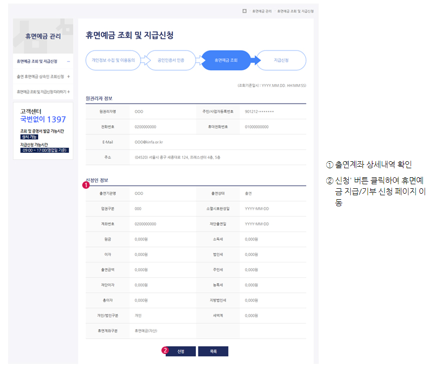 확인을 하신 금액은 여러분들이 주로 사용하는 계좌로 송금을 바로 할 수 있도록 신청을 하시는 것이 가능한데요. 신청이라는 버튼을 눌러주시면 되겠습니다.