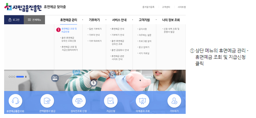 휴면예금 관리에 마우스를 올려두신 다음 그 하단에 있는 휴면예금 조회 및 지급신청이라는 메뉴를 눌러주시면 되겠습니다. 눌러주신 다음 과정 계속해서 진행을 해주시면 되겠습니다.