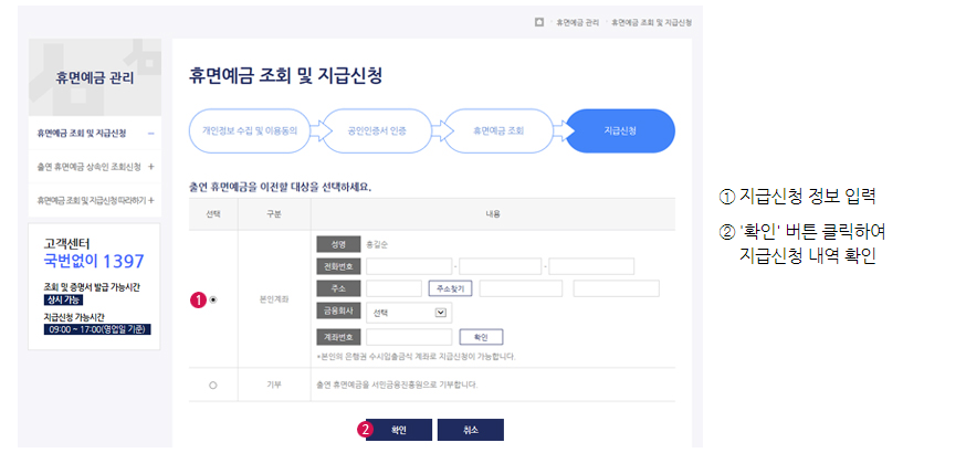 기부를 하실 분들 보다는 아무래도 각자의 계좌로 송금을 신청하시는 분들이 많지 않을까 하는 생각을 해보는데요. 각각의 항목에 대한 정보를 입력해주신 다음 하단에 있는 확인을 눌러주시면 되겠습니다.