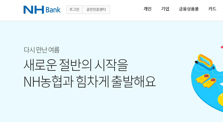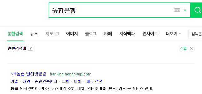 제가 어떤 검색사이트를 이용했는지는 굳이 말씀드리지 않아도 아마 다들 잘 아시지 않을까 하는데요. 좌우지간 보시면 주소도 함께 안내가 되어있으니 주소 기억을 해두시는 것도 나중에 농협은행 인터넷뱅킹 사용을 위한 좋은 방법이 아닌가 생각이 됩니다. 아무튼 주소를 입력하시건 검색사이트를 이용하시건 홈페이지로 이동을 하시면 되겠는데요.