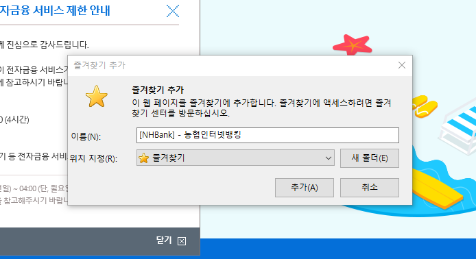 눌러주시고서 역시나 마찬가지로 추가 버튼 눌러주시게 되면 즐겨찾기에 등록을 하는 것이 가능하니 어렵지 않게 바로가기를 통해서 좀 더 수월하게 농협은행 개인인터넷뱅킹을 이용해보실 수가 있지 않을까 생각이 됩니다. 그래서 오늘 전하고자 하는 내용은 여기까지인데 어떻게 도움이 좀 되셨는지 모르겠습니다. 다음에 또 좋은 내용으로 인사드릴 수 있도록 하겠습니다. 감사합니다.