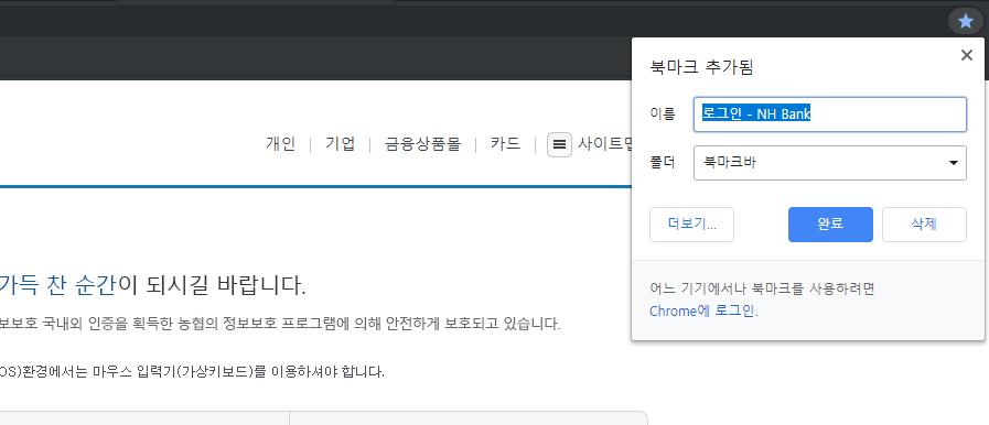 우선 농협은행 홈페이지로 이동을 하신 다음 우측 상단에 있는 주소창 우측에 있는 별표 모양을 눌러주시면 북마크 추가를 위한 간단한 설정창이 나오게 되겠는데요. 따로 설정할 필요없이 그냥 완료 버튼 눌러주시면 되겠습니다.