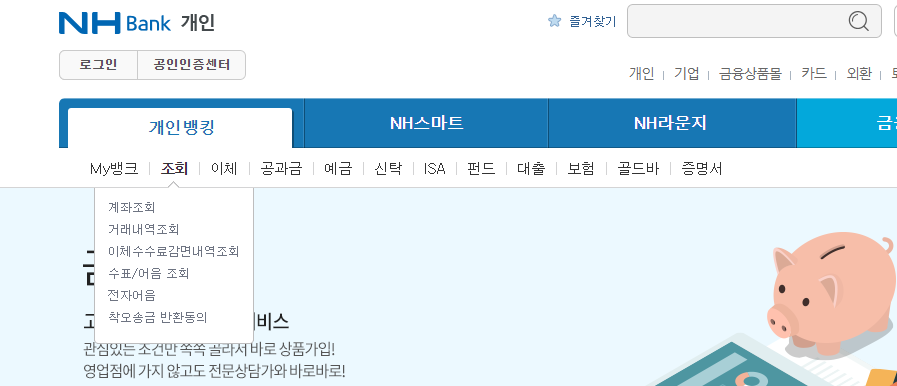 이동을 하시고 나면 개인인터넷뱅킹을 통해서 이용할 수 있는 각종 서비스들을 확인해보실 수가 있겠는데요. 이중에서 여러분들이 이용을 하고자 하는 서비스를 하나 선택을 해주시면 되겠습니다. 저는 계좌조회 서비스를 한번 눌러볼까 하는데요.