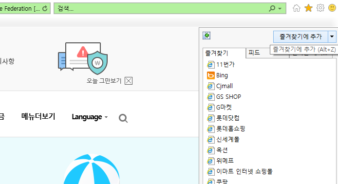 익스플로러 역시도 거의 동일한 방법으로 바로가기를 등록하시는 것이 가능하겠는데요. 마찬가지로 주소창 우측에 있는 별표를 눌러주시면 되겠습니다. 그리고 즐겨찾기에 추가라는 버튼을 눌러주시면 되겠는데요.