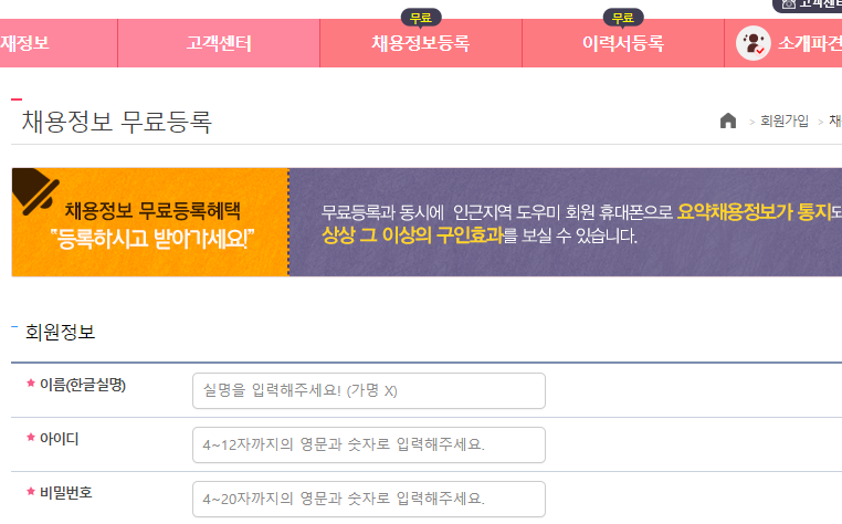 일을 하고자 하는 분들 뿐만 아니라 일할 사람을 구하고자 하는 사람들 역시도 단디헬퍼의 도움을 받아보실 수가 있겠는데요. 홈페이지 첫화면에 있는 채용정보등록이라는 메뉴를 선택하시고서 간단한 정보 입력하시면 간단하게 이용을 해보실 수가 있게 되겠습니다.