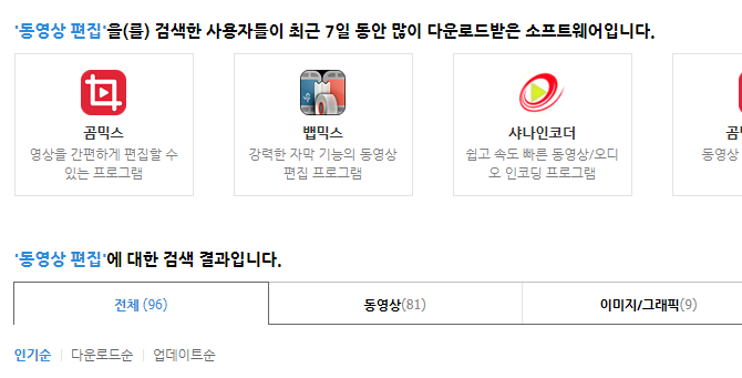 보시는 것처럼 검색창에 동영상 편집이라고 입력을 해주신 다음 검색을 시도해주시게 되면 지난 1주일 동안 가장 많이 다운로드가 된 동영상 편집 프로그램을 바로 확인을 해보실 수가 있겠습니다. 이중에서 하나 선택하셔서 사용하시는 것도 무난하게 동영상 편집을 할 수 있는 좋은 방법이 아닌가 하는 생각을 해보는데요.