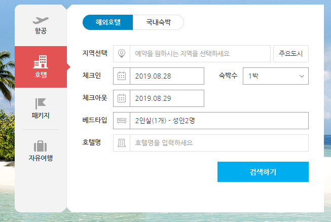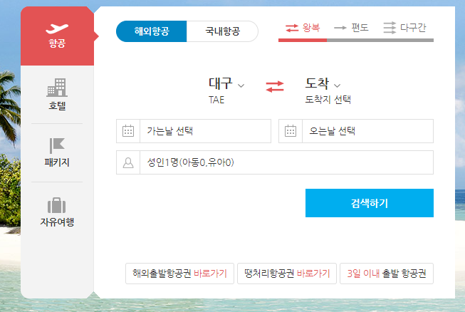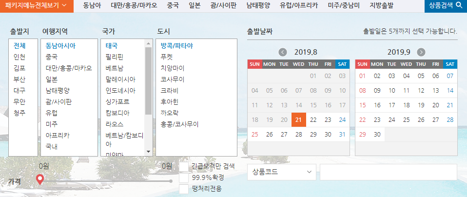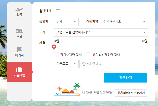 상단의 메뉴를 이용해서 여러분들이 여행을 하고자 하는 목적지와 관련된 설정을 해주시면 되겠습니다. 차례대로 출발지와 여행지역 그리고 국가와 도시 마지막으로 출발날짜까지 선택을 해주신 다음 검색을 시도해주시면 되겠습니다.