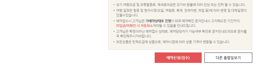 상품 이미지 우측 하단에 보시면 예약신청이라고 되어있는 버튼이 보이실텐데요. 해당 버튼을 이용해서 바로 그 자리에서 땡처리 패키지여행을 예약하시는 것이 가능하게 되죠.
