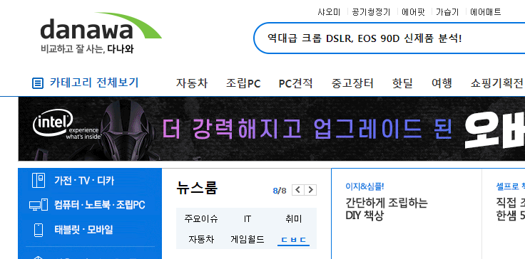 위에서 보시는 화면은 앞서서 말씀을 드린 다나와라는 사이트의 메인 화면이 되겠습니다. 주소 모르시는 분들은 검색사이트 이용하시면 쉽게 이동을 해보실 수가 있겠는데요.
