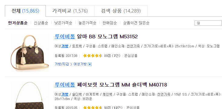 많은 사람들이 사용을 하는 사이트이니 만큼 해당 인기순위 좀 더 신뢰를 가지고서 참고를 해도 되지 않을까 하는 생각을 해보는데요. 인기순위 뿐만 아니라 가격이나 상품의견 등등 다양한 항목을 기준으로 한 순위를 확인할 수가 있으니 참고해보셔도 좋지 않을까 하는 생각을 해봅니다. 아무튼 이렇게 해서 루이비통 가방 인기순위를 확인하는 것이 가능하겠는데요.