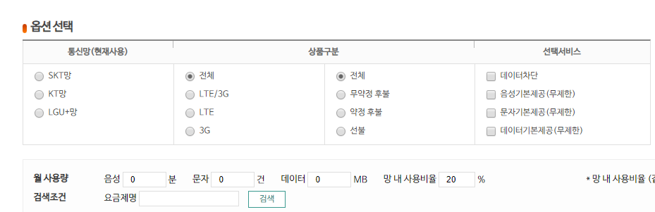 각각의 옵션 선택에 대한 설정을 하시고서 그 하단에 월 사용량에 관한 내용을 입력해주시게 되면 여러분들이 설정한 조건에 맞는 요금제가 나오는 것을 확인하실 수가 있게 되겠는데요.