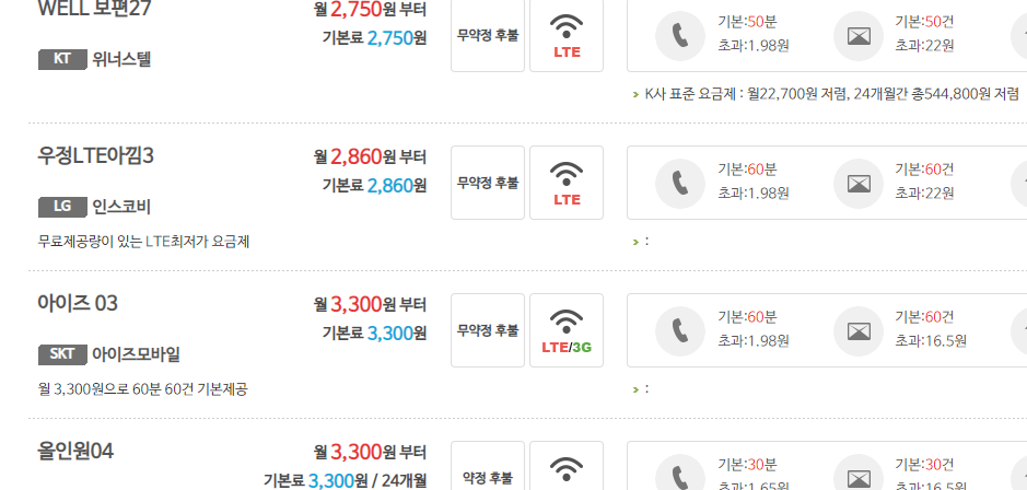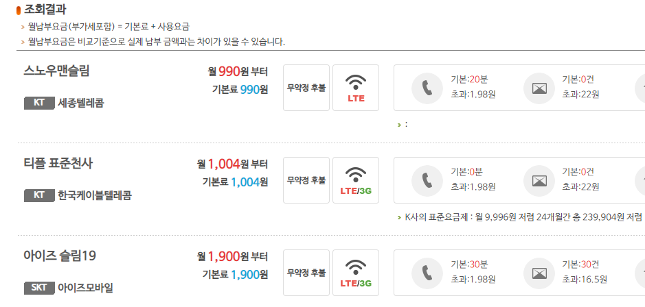 추천 휴대폰이라고 해서 기종별로 한달에 얼마의 요금을 통해서 알뜰폰을 이용하는 것이 가능한지 간단하게 나와있는 것을 확인해보실 수가 있으실텐데요.