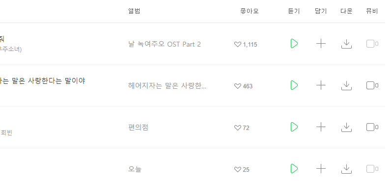 순위에 있는 각각의 리스트 우측에 보시면 듣기라고 되어있는 메뉴를 확인해보실 수가 있겠습니다. 듣기 기능은 물론이거니와 뮤비가 있는 경우라면 바로 뮤비도 감상을 할 수 있게끔 서비스를 제공하고 있는 중인데요. 좌우지간 듣고자 하는 음악이 있다면 리스트 우측에 있는 세모로 된 플레이 버튼 눌러주시면 되겠습니다.
