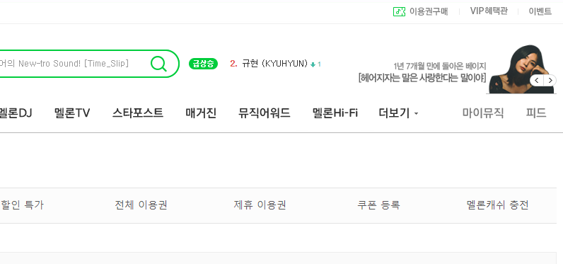 너무나도 당연한 이야기가 되겠습니다만 음악 감상을 위해서는 멜론 이용권을 구매하셔야만 하겠습니다. 홈페이지 상단 우측에 있는 이용권구매라고 되어있는 메뉴를 이용하시면 다양한 이용권들의 종류를 바로 확인을 해보시는 것이 가능하겠는데요.