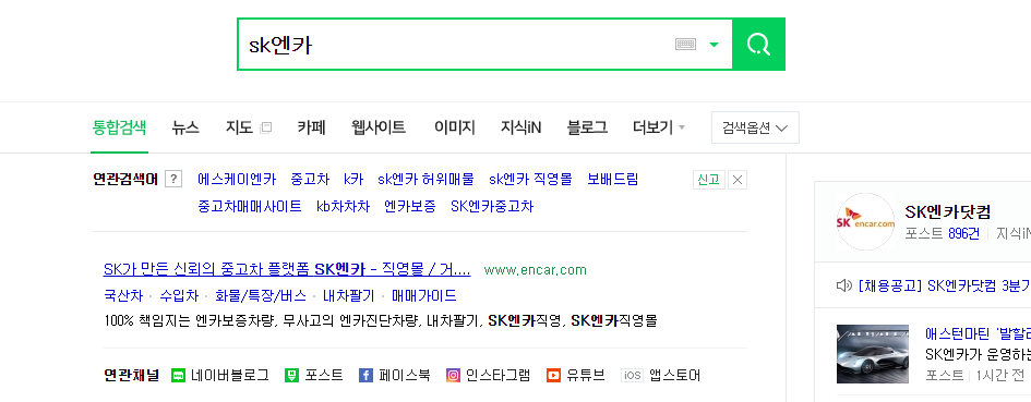주소를 직접 입력하셔도 되겠습니다. 아니면 저처럼 검색사이트를 이용하셔서 이동을 해주셔도 무방합니다. 어떠한 방식으로건 sk엔카 홈페이지로 이동을 하시면 제가 보는 것과 동일한 화면을 보실 수가 있으실텐데요.