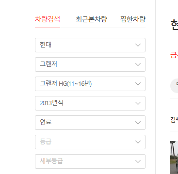여러분들이 구매를 하고 있는 차량이 다들 있으리라 생각이 되는데요. 위에서 보시는 것과 같은 검색 기능을 이용해서 브랜드부터 시작을 해서 차종 그리고 연식 및 연료 등등을 선택해주시면 되겠습니다. 저는 위에서 보시는 것처럼 현대 자동차의 그랜저 모델 2013년식을 한번 검색해볼까 하는데요. 참고로 연료는 따로 지정을 하지 않았습니다.